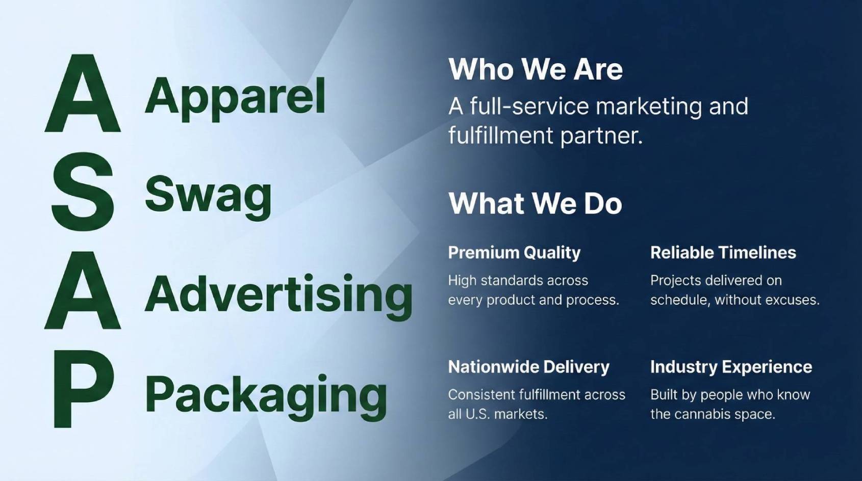 ASAP Marketing is the complete partner for cannabis brands. We handle every step from creative design and production to warehousing and national drop shipping. That means fewer vendors, fewer headaches, and faster delivery to every location, no matter the size.